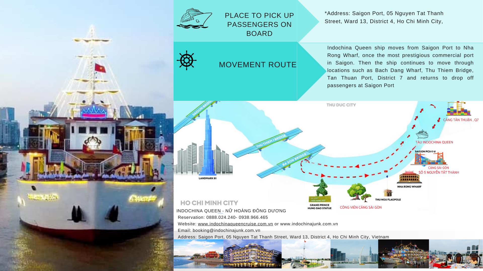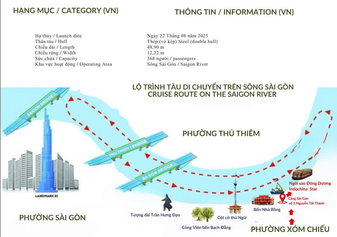 • 19h30: Tàu bắt đầu khởi hành hành trình đến cầu Thủ Thiêm, xuôi dòng sông Sài Gòn qua bến Nhà Rồng. Dọc theo các bến cảng, du khách được ngắm cảnh thành phố Hồ Chí Minh rực rỡ sắc màu, lung linh huyền ảo về đêm.